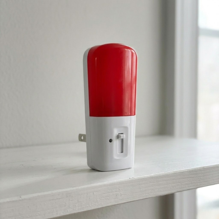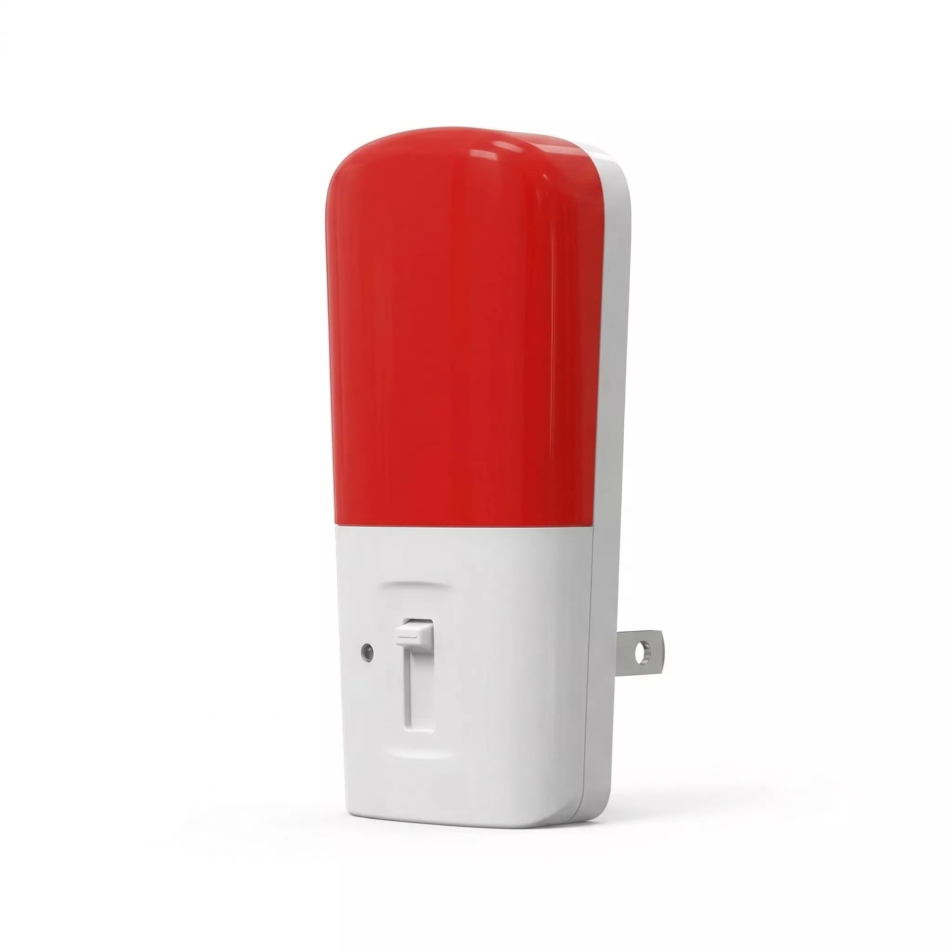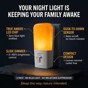 The built-in dusk-to-dawn photocell sensor activates it automatically in darkness and shuts it off in daylight. A smooth slide switch lets you dial brightness — 5 to 80 lumens on the Amber, 0 to 100 lumens on the Red. The compact plug-in design won't block your second outlet. No app required. No Wi-Fi. No smart-home setup. Just plug it in and reclaim your nights.