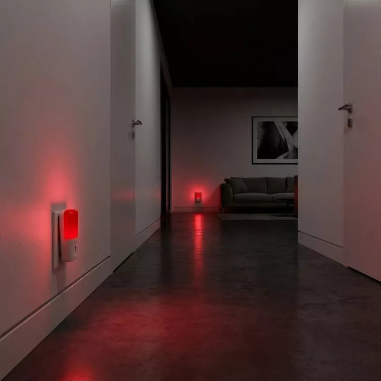 Plug the night light into any standard wall outlet at your desired location. Choose from bedroom, hallway, nursery, bathroom, stairway, or kitchen. The compact design won't block your second outlet. Select your variant — Amber (2000K) or Soft Red.