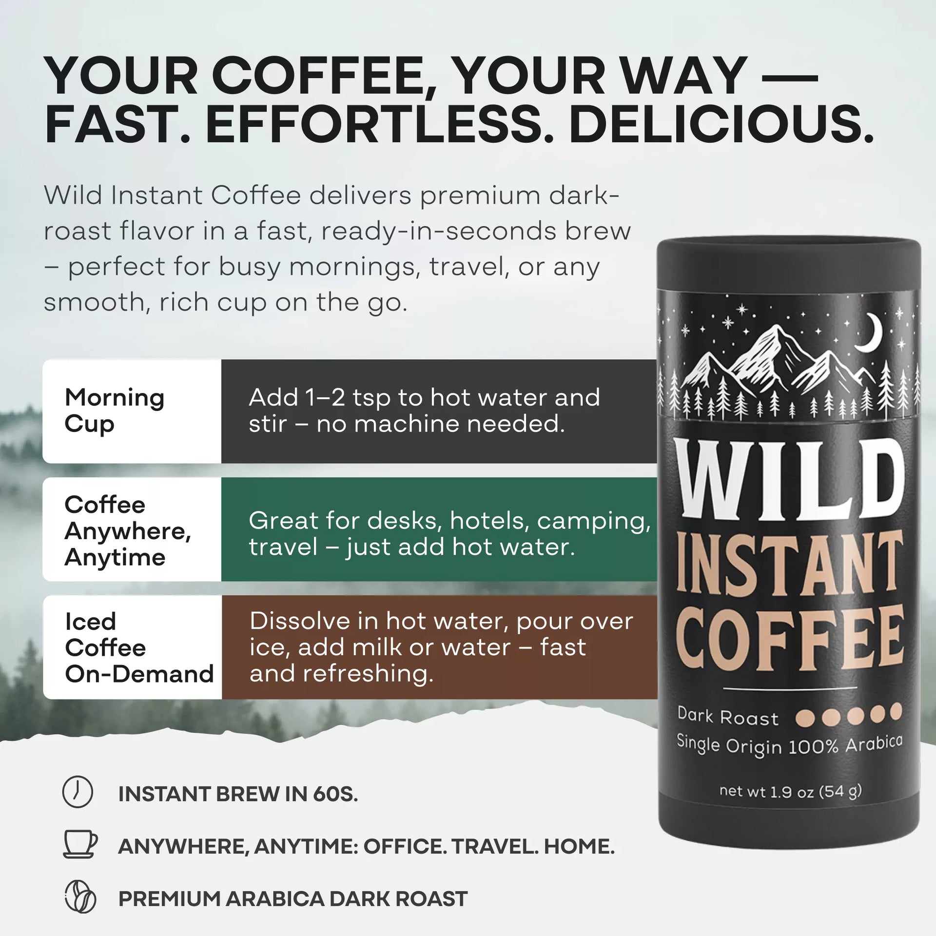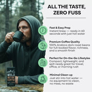 Designed for movement—lightweight, mess-free, and TSA-friendly. From mountain hikes to morning commutes, Wild Instant Coffee keeps you caffeinated wherever life takes you. Great coffee, anytime, anywhere.