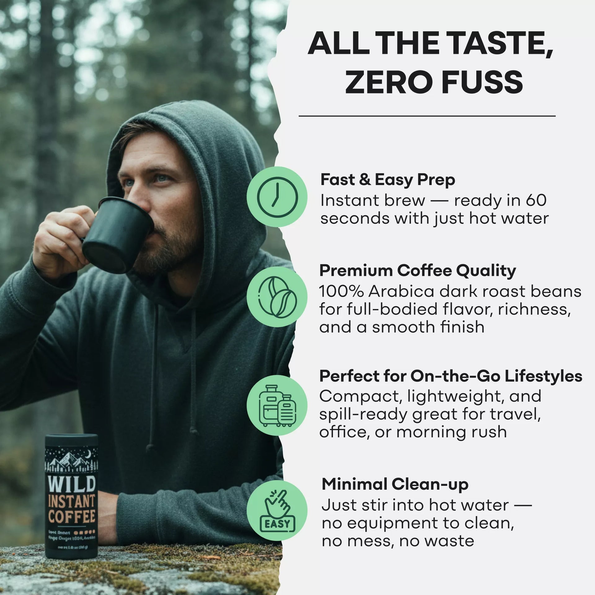 “No more watery hotel coffee or mystery office pods. One spoon of Wild Instant Coffee and I get a strong, smooth cup every time.”