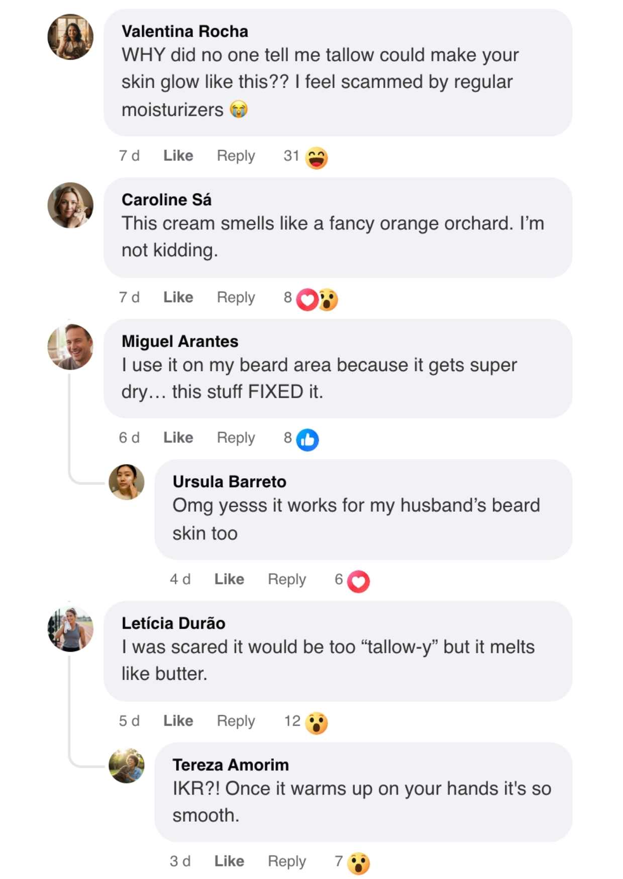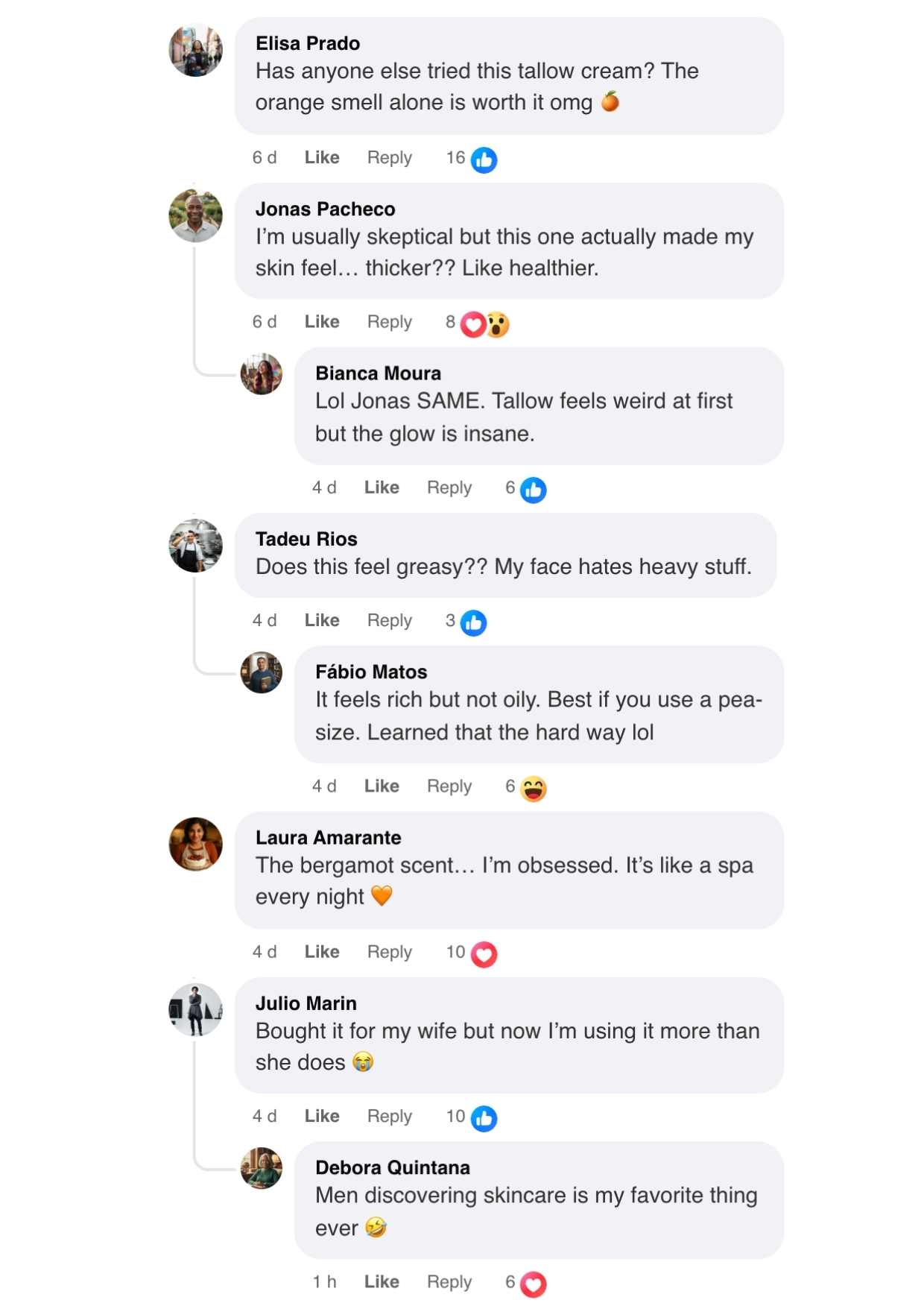 My skin gets dry and irritated, especially around my beard, and most moisturizers either sting or make me shiny. This tallow cream has been a game changer. It goes on with a bit of grain, then melts in quickly and leaves my face comfortable all day. No strong perfume, no greasy feel—just soft, calm skin. My wife keeps stealing it, so we might need a second jar.