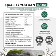 Just real bone broth and probiotics—no fillers, no artificial additives, no junk. Clean, simple, and crafted for pet parents who want real nutrition, not marketing gimmicks.