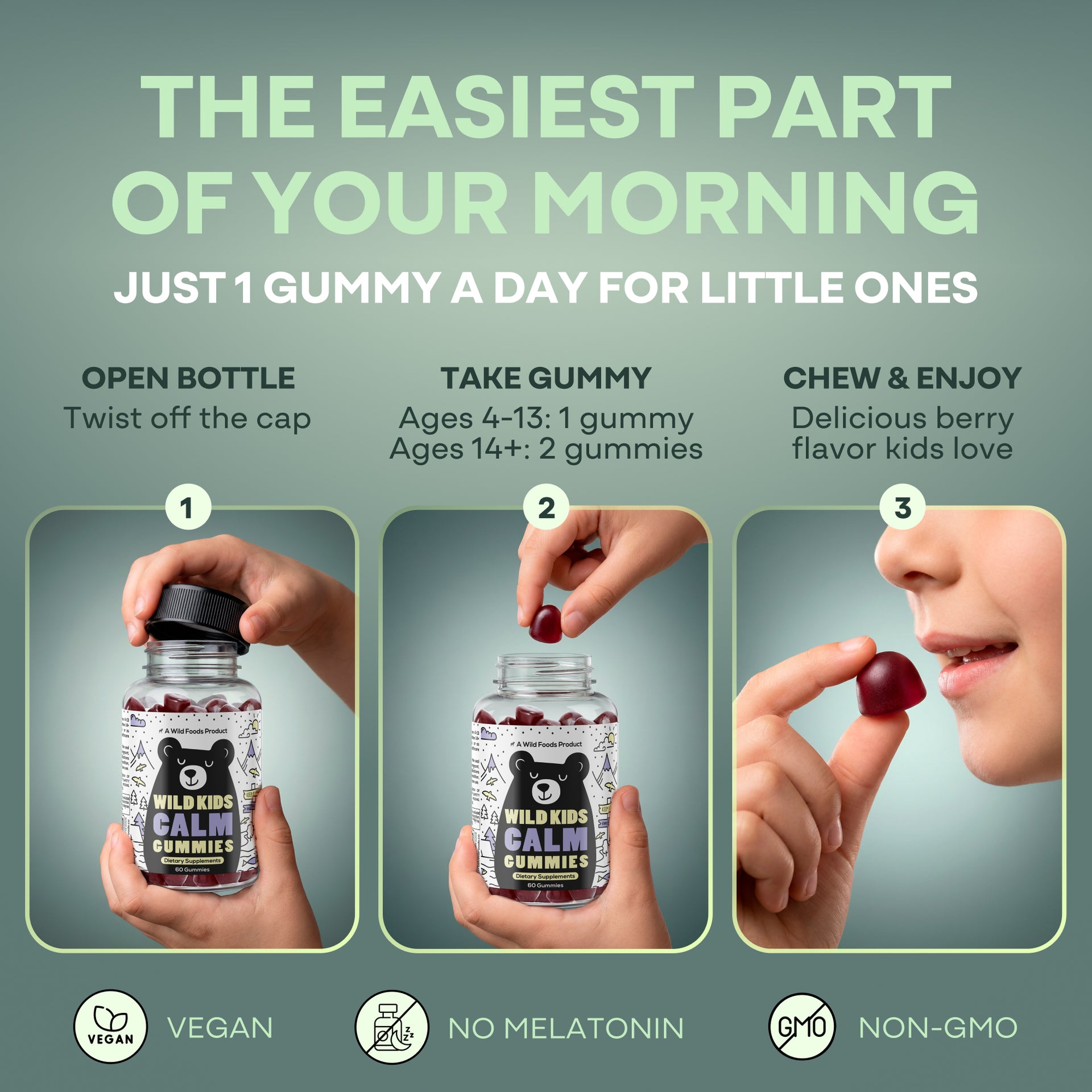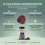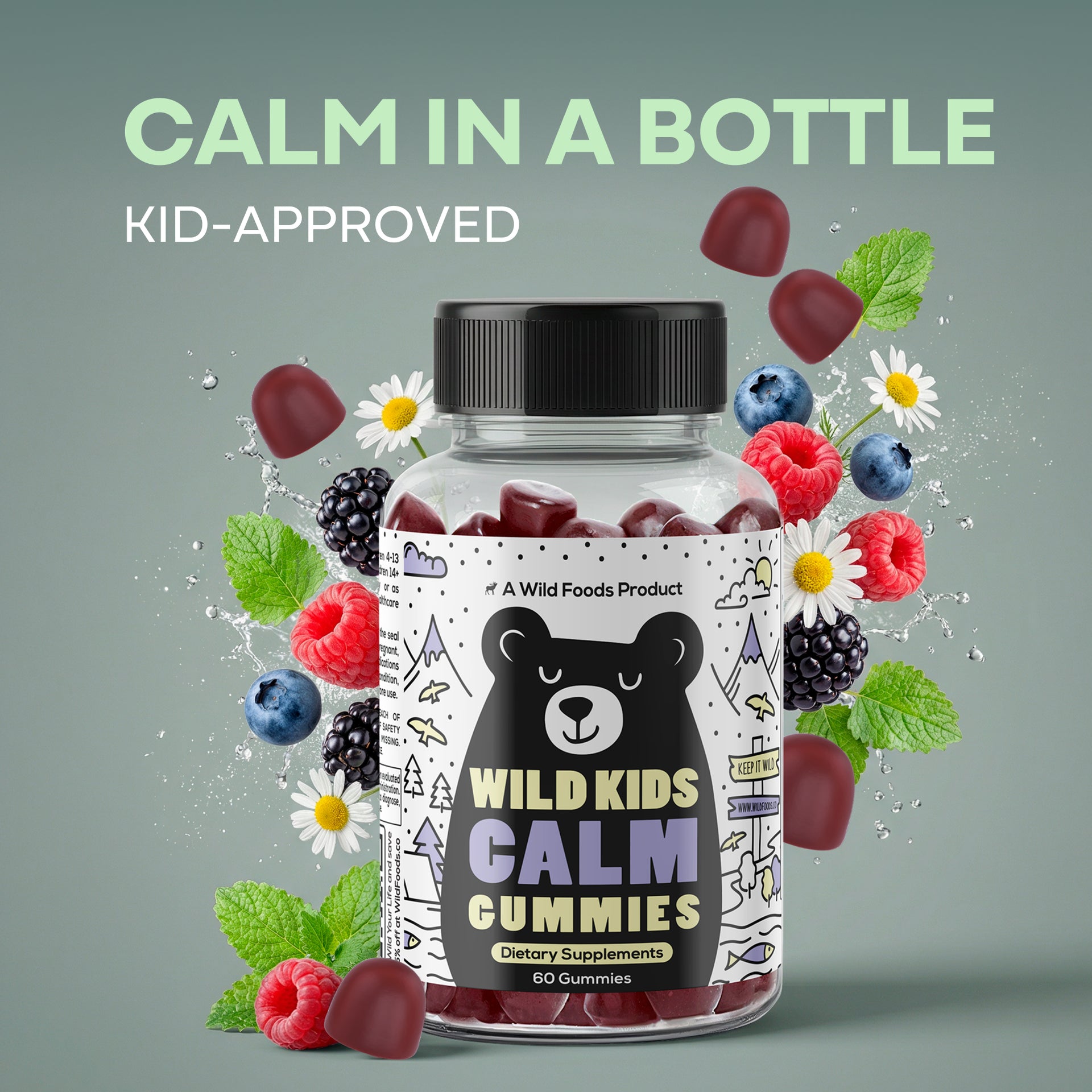 Wild Kids Calm Gummies combine multiple calming and focus-enhancing botanicals—such as Ashwagandha, GABA, L-Theanine, Lemon Balm, and Chamomile. They’re specifically crafted to support relaxation, better sleep, and improved concentration, all while being kid-approved in flavor.
