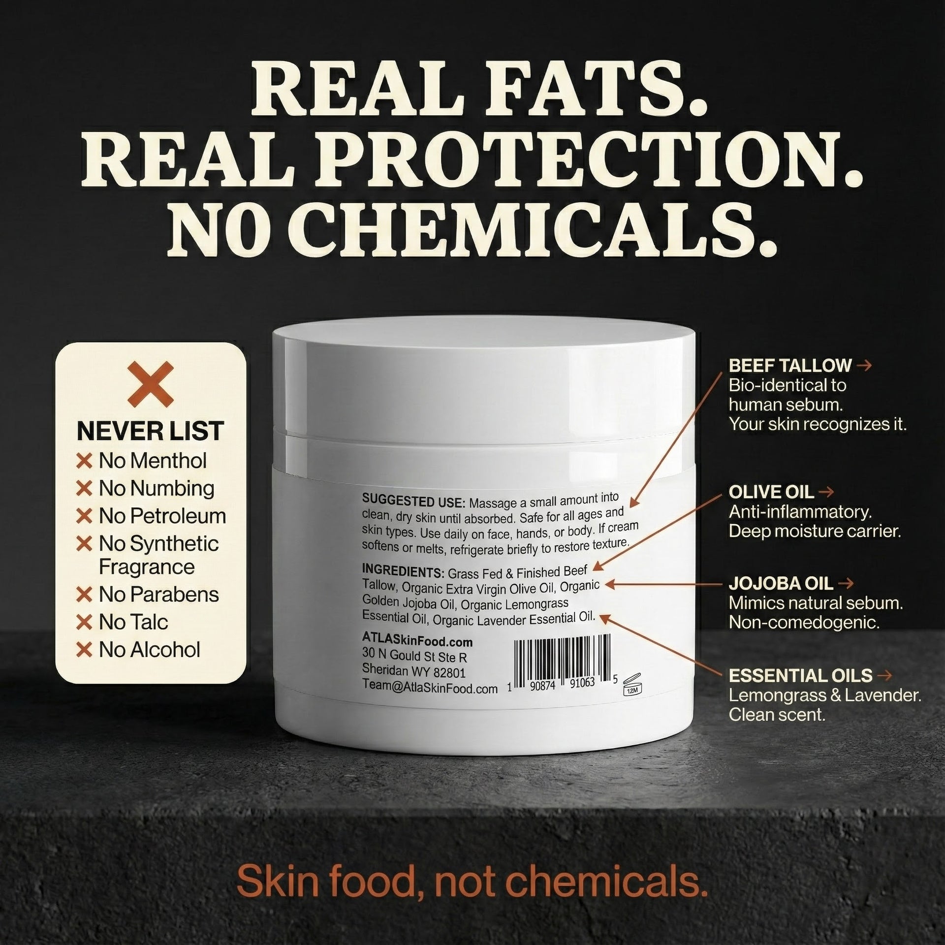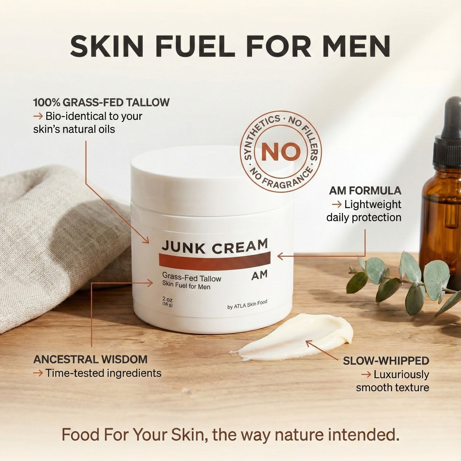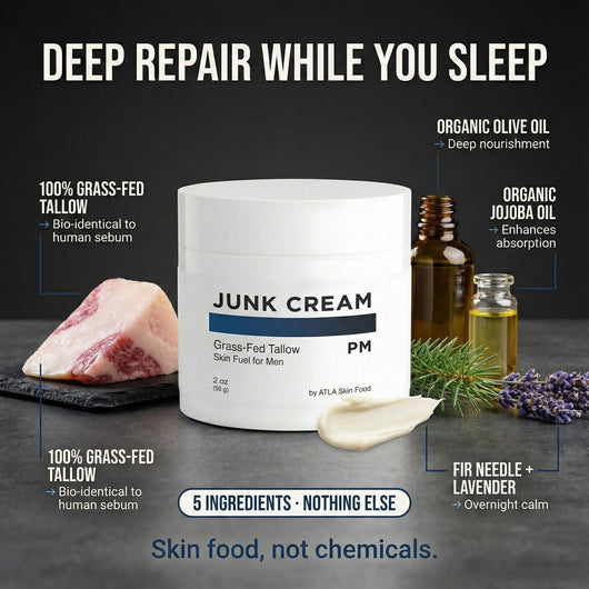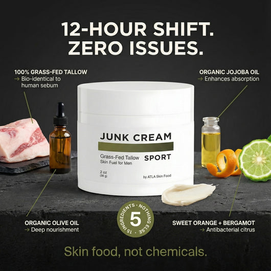 ATLA JUNK CREAM is grass-fed tallow that your skin actually recognizes—not petroleum, not menthol, not another product that masks the problem for an hour then quits.