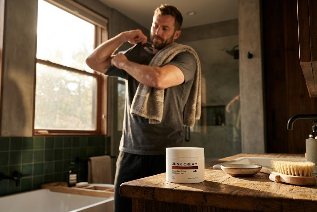"I used to stand in the men's section grabbing whatever promised 'all-day protection.' None of it worked. With JUNK CREAM, the ingredient list is short, I understand what's in it, and my skin finally feels protected instead of coated. I'm not looking for the next thing anymore."