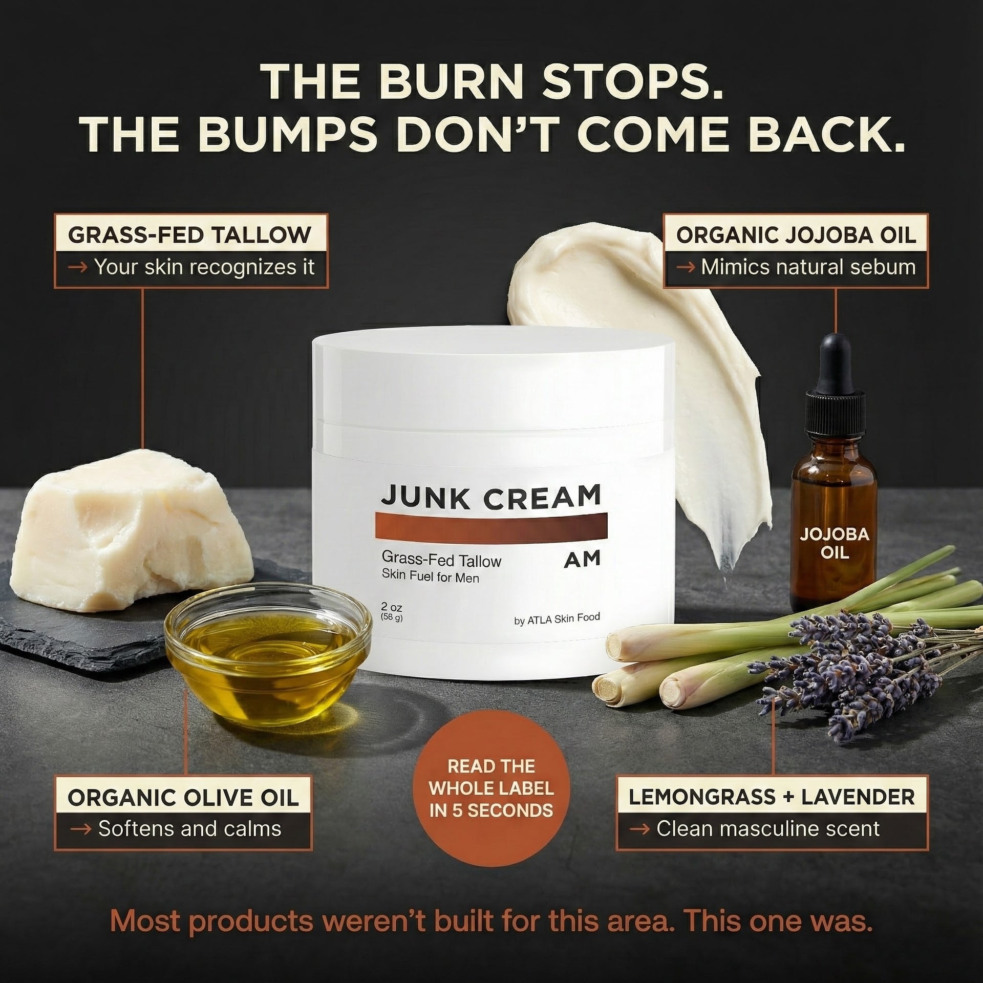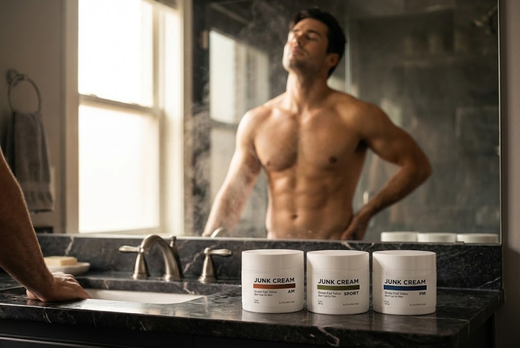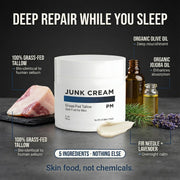 The JUNK CREAM Solution uses grass-fed tallow—fats your skin actually recognizes—combined with organic olive oil and jojoba to absorb deep, calm inflammation fast, and rebuild your skin's natural barrier from the inside out.