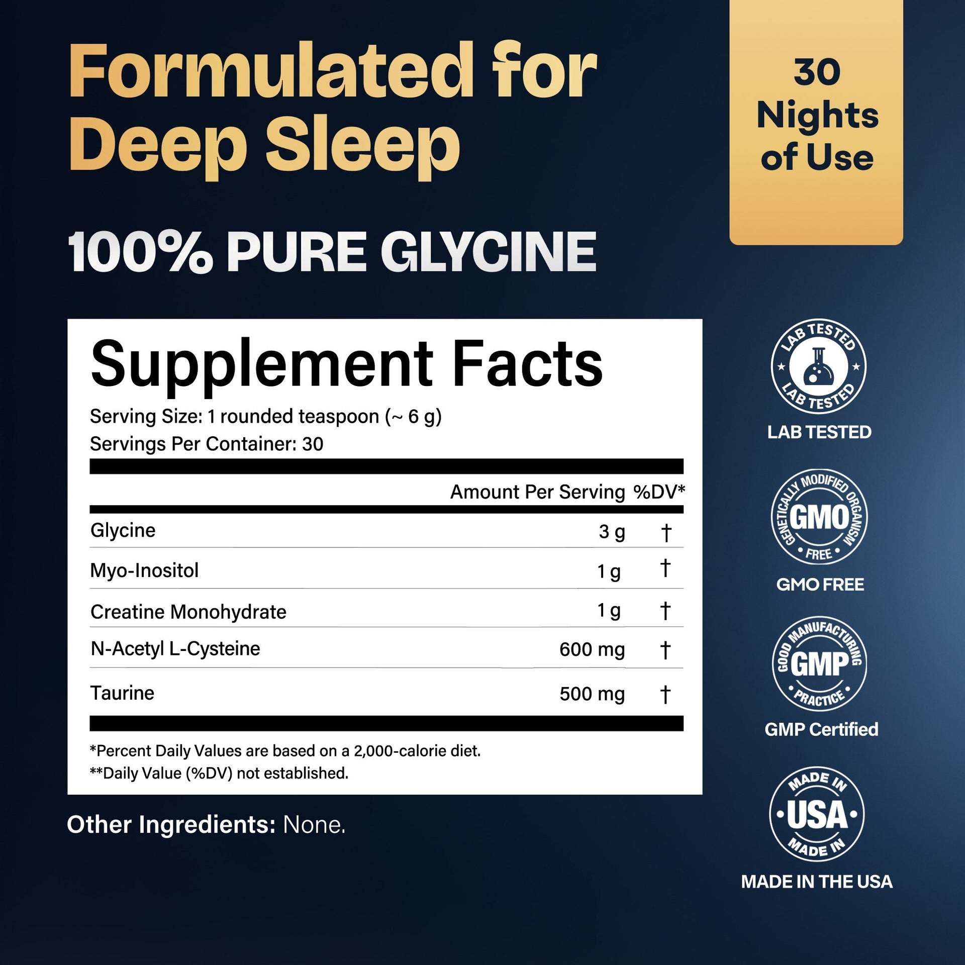 Glycine at 3g promotes slow-wave sleep—the most restorative phase—by lowering core body temperature and calming wake signals.