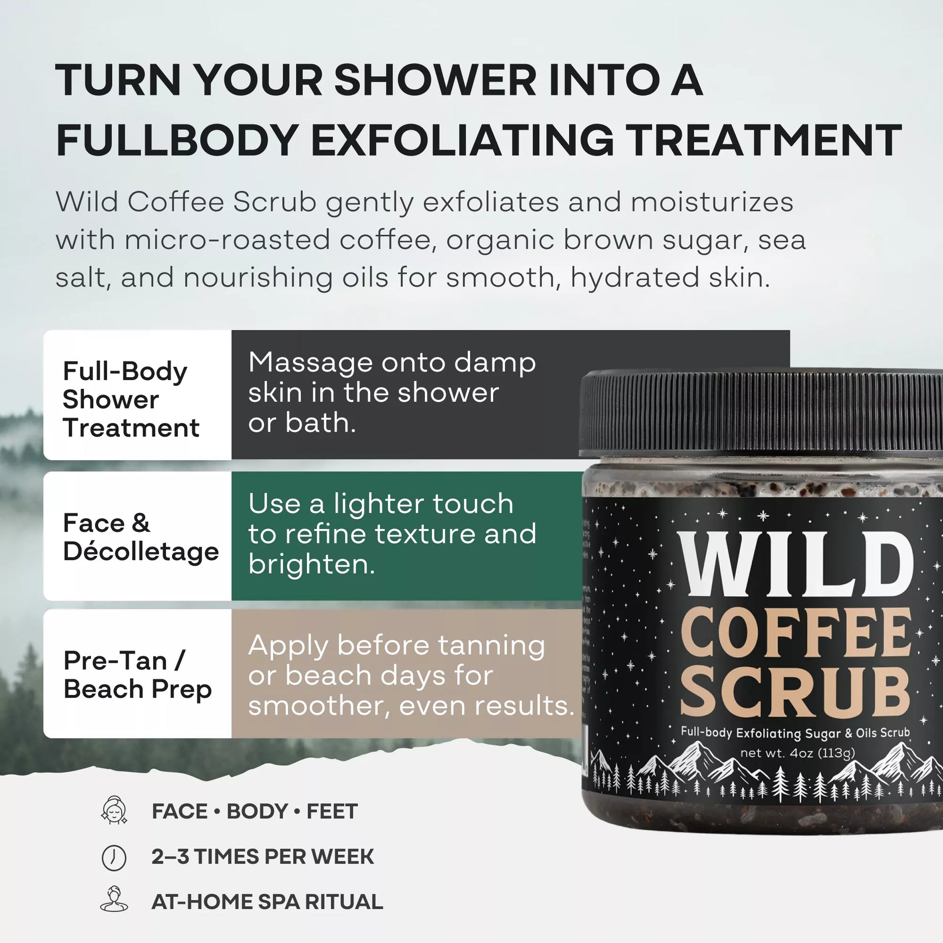 Formulated with biodegradable exfoliating particles and food-grade, organic ingredients, Wild Coffee Scrub gives you spa-quality results in your own shower—without harsh chemicals or microplastics.