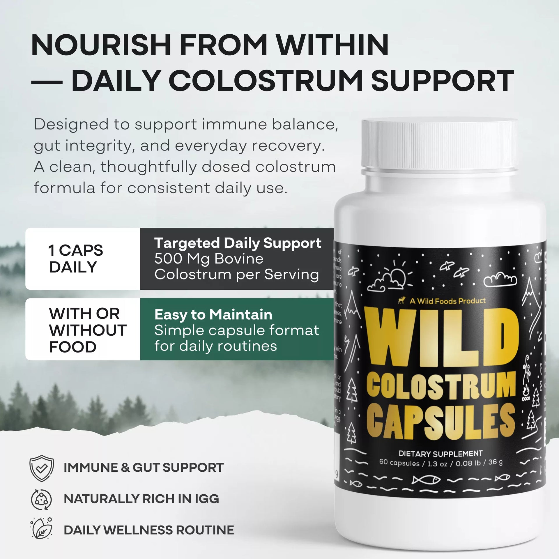 500mg Colostrum with 30% Immunoglobulin G (IgG) per capsule. 60 capsules per bottle. Other ingredients include gelatin (bovine), vegetable magnesium stearate, and silicon dioxide. Manufactured in the USA. Best enjoyed as 1–3 capsules per day—adjust according to wellness needs and healthcare professional guidance.