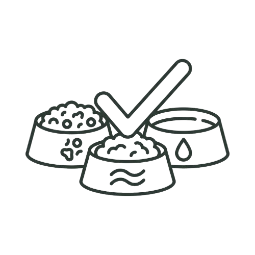 A line drawing of a hand adding a powder supplement and a liquid drop to a bowl of pet food.