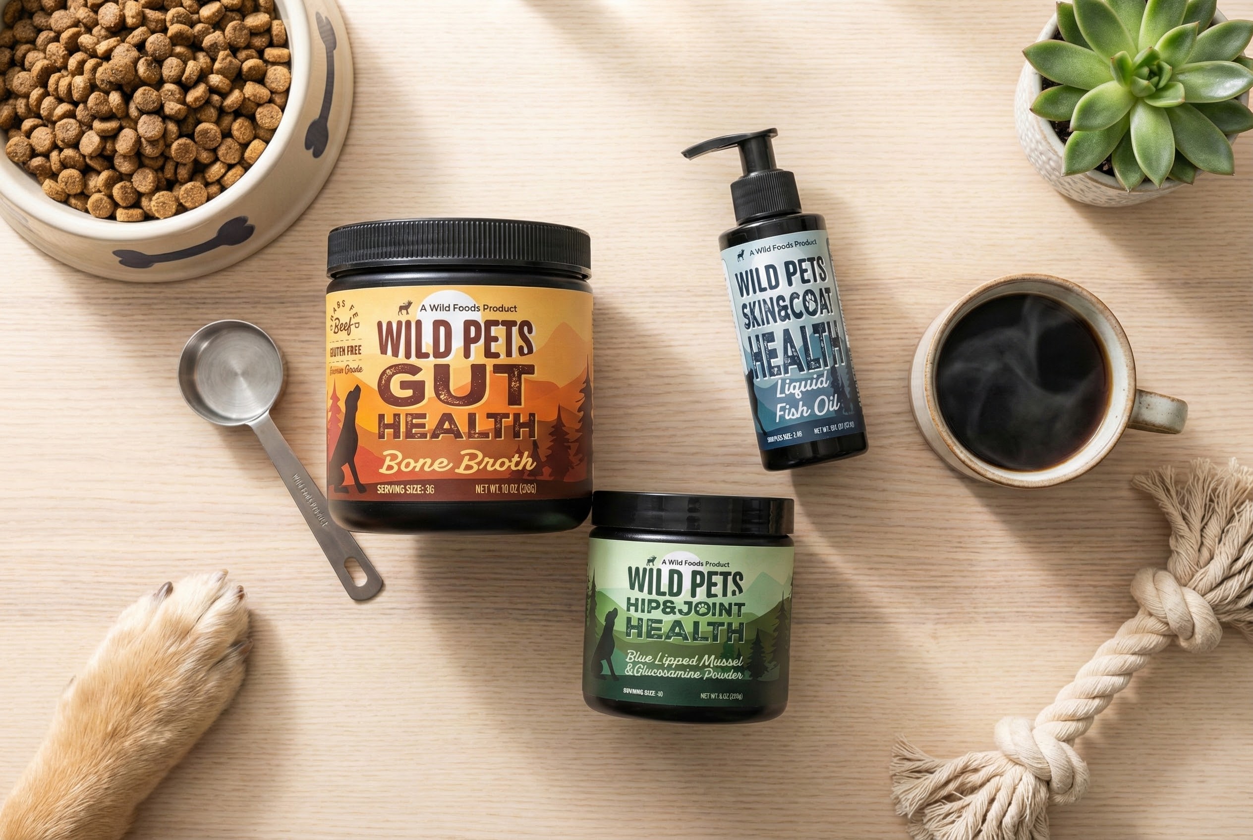 I went all in and got all three Wild Pets products. The bone broth for gut health, fish oil for his coat, and hip & joint for mobility. My dog has never been healthier. Shinier coat, better digestion, more energy. This feeding station setup makes our routine so easy. Best investment for my fur baby.