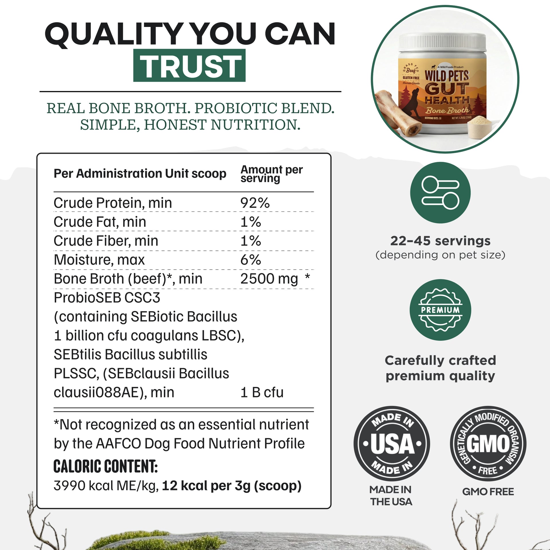 Unlike cheap fillers or synthetic supplements, WILD PETS BUNDLE for Dogs delivers nature's most powerful gut remedy with real collagen, amino acids, and probiotic support—perfect for daily meals, picky eaters, and dogs who deserve better nutrition.