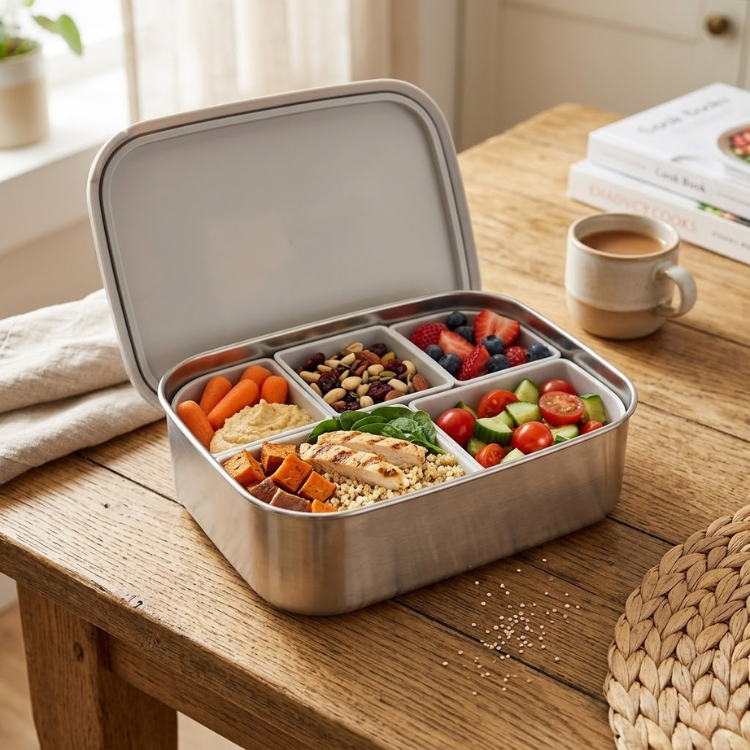 Five compartments for families who want variety. Pack a complete meal in one container: protein, carbs, vegetables, fruit, and a treat. Made with a 304 stainless steel body and a removable BPA-free silicone seal. No more soggy crackers. No more sauce disasters.