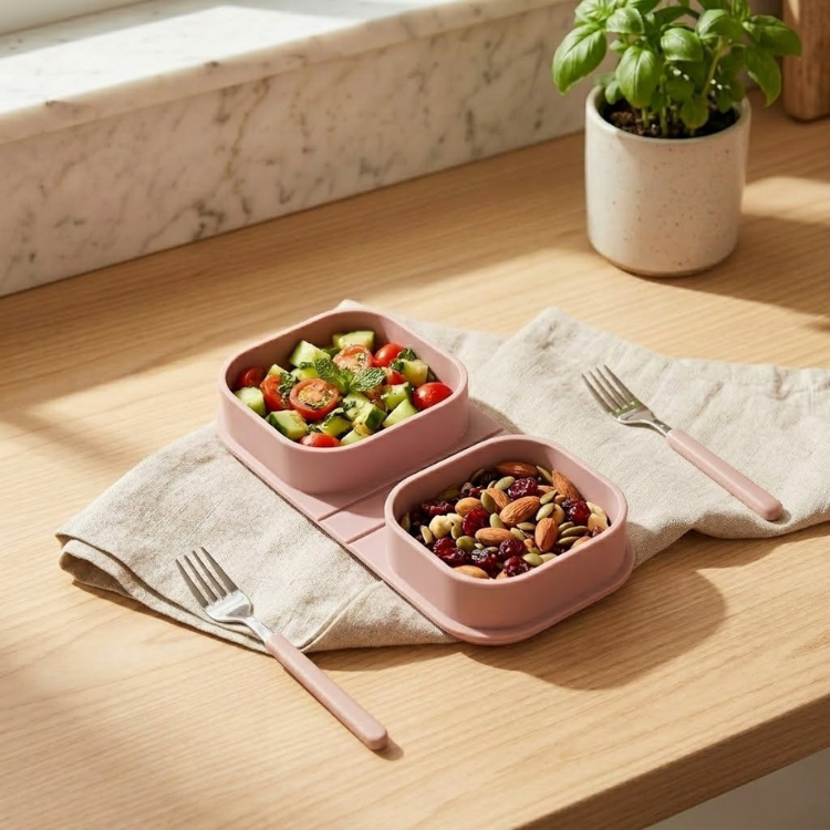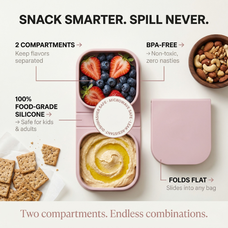 What Fits Inside: Hummus + baby carrots. Peanut butter + apple slices. Crackers + cheese. Trail mix + chocolate chips. Two snacks, zero spills.