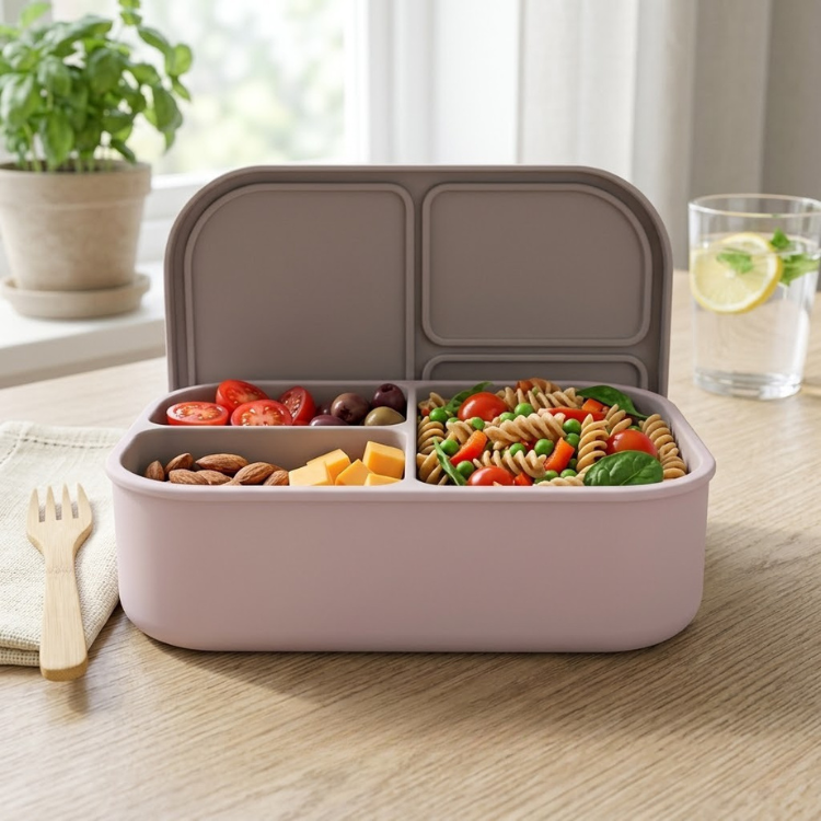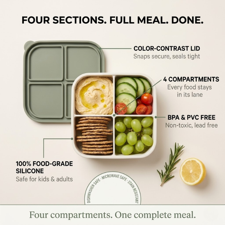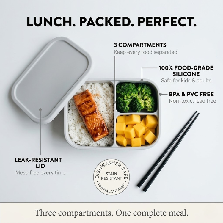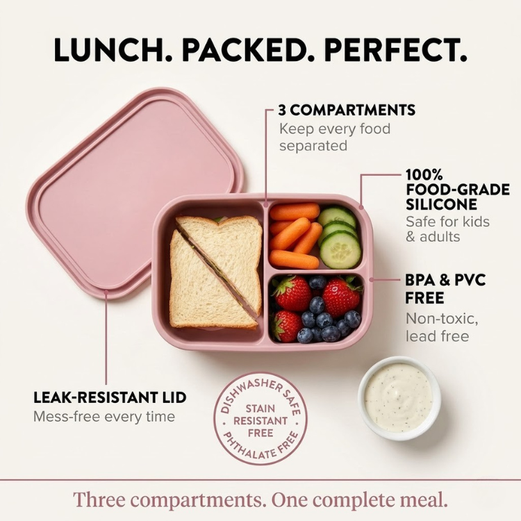 Three compartments. Pack a complete lunch without mixing flavors or making a mess. Made from 100% food-grade, BPA-free, PVC-free silicone — soft, flexible, and built for daily use. The secure lid keeps everything in place from home to school to office.
