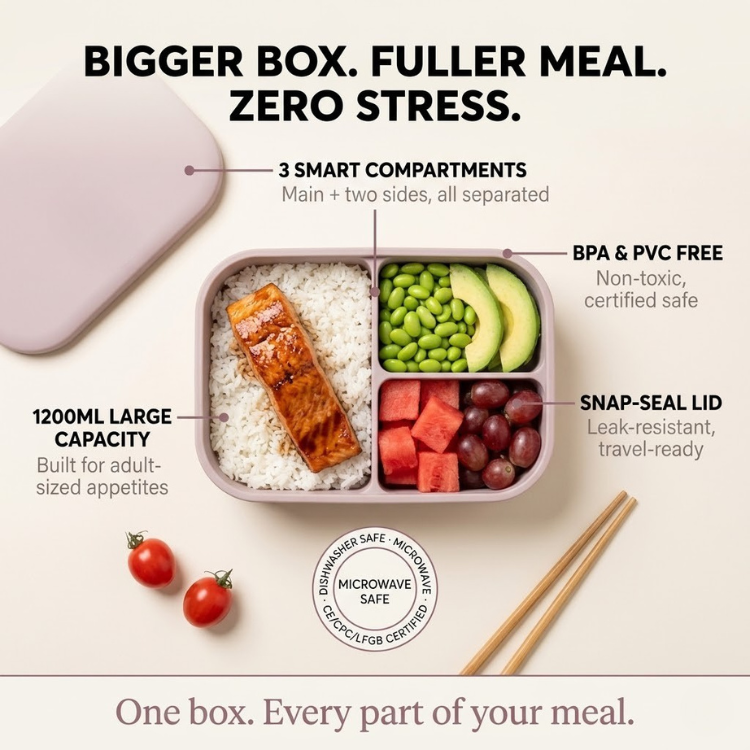 More capacity. More variety. The 1200ml large silicone bento box fits a complete adult meal without compromise. Three smart compartments — one large section for your main and two smaller sections for sides — keep every part of your lunch separated and fresh. Made from 100% food-grade, BPA-free silicone with a matching snap-seal lid. Soft enough to pack in any bag. Tough enough for every day.
