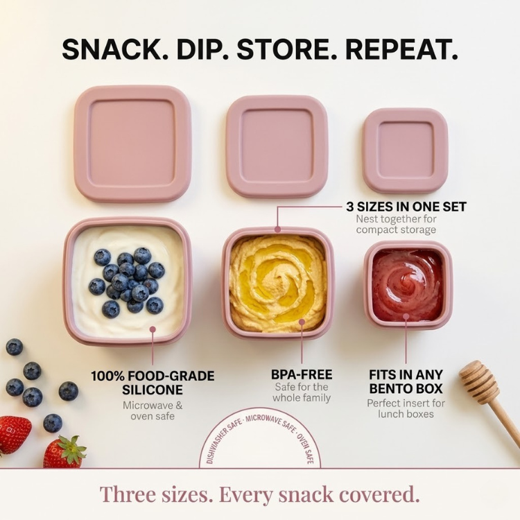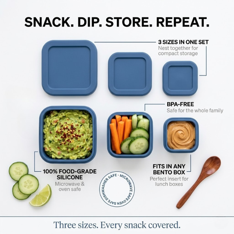 The container set that does it all. Three perfectly sized silicone containers that nest inside each other for compact storage, then spread out to organize snacks, sauces, dips, and meal prep like a pro. Use them solo, stack them together, or drop them straight into your bento box. Made from 100% food-grade silicone — microwave safe, oven safe, dishwasher safe, and built to last.