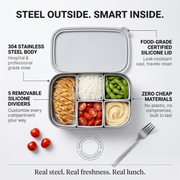 Steel on the outside. Smart silicone on the inside. This premium lunch box combines a durable 304 stainless steel body with removable food-grade silicone dividers that create perfectly organized compartments for every part of your meal. No plastic touching your food. No odors. No stains. Just a clean, reliable lunch box that gets better with every use.
