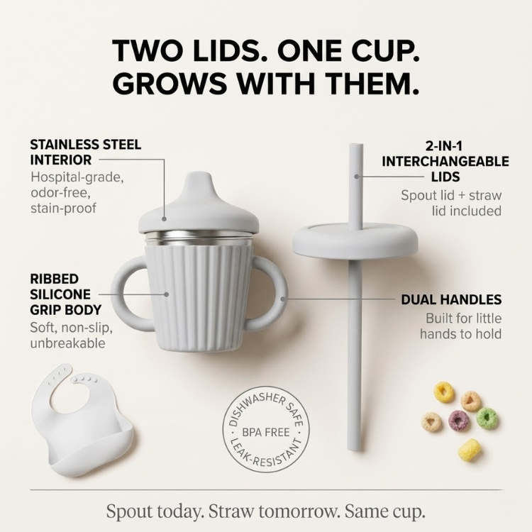 Two lids. One cup. Total freedom. Switch between the soft silicone spout lid for early drinkers and the straw lid for independent sippers — no need to buy two cups. The ribbed silicone body wraps a stainless steel interior that keeps drinks fresh, resists odors, and never stains. Dual handles give little hands full control. Built for the floor, the car, the bag, and everything in between.