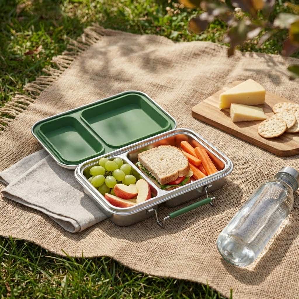 Our boxes are 100% plastic-free and crafted from durable stainless steel with a food-safe silicone seal, so there’s no plastic contacting food, no lingering odors, and no chemical leaching.