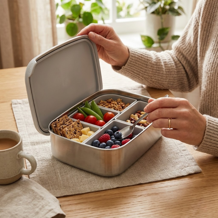 Five compartments for families who want variety. Pack a complete meal in one container: protein, carbs, vegetables, fruit, and a treat. Made with a 304 stainless steel body and a removable BPA-free silicone seal. No more soggy crackers. No more sauce disasters.