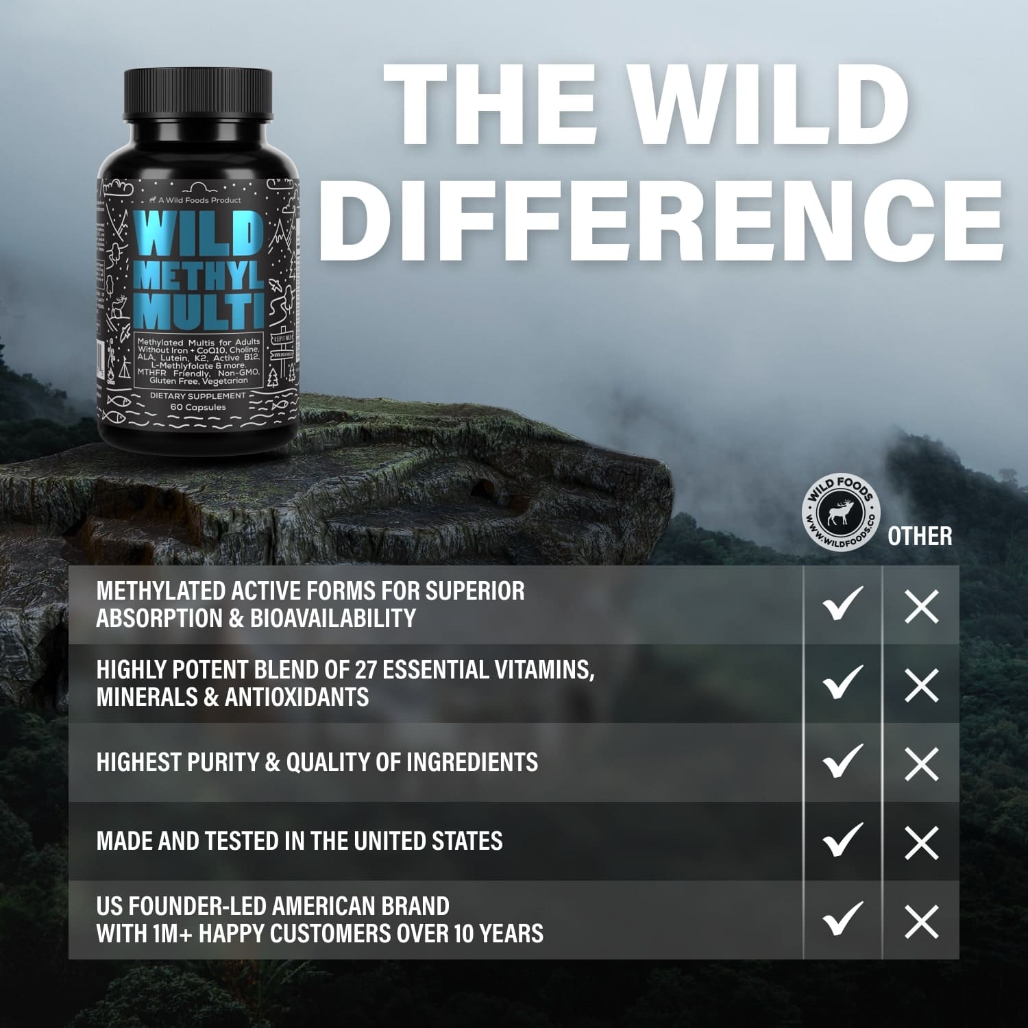 Why Choose Wild Foods Methyl Multi? Our Methyl Multi is meticulously crafted to provide optimal nutrition, ensuring your body receives the highest quality nutrients. Free from iron, it’s ideal for those who need to limit iron intake. Whether you're looking to boost your energy levels, support your heart and brain, or enhance your overall wellness, Wild Foods Methyl Multi is your go-to daily supplement.