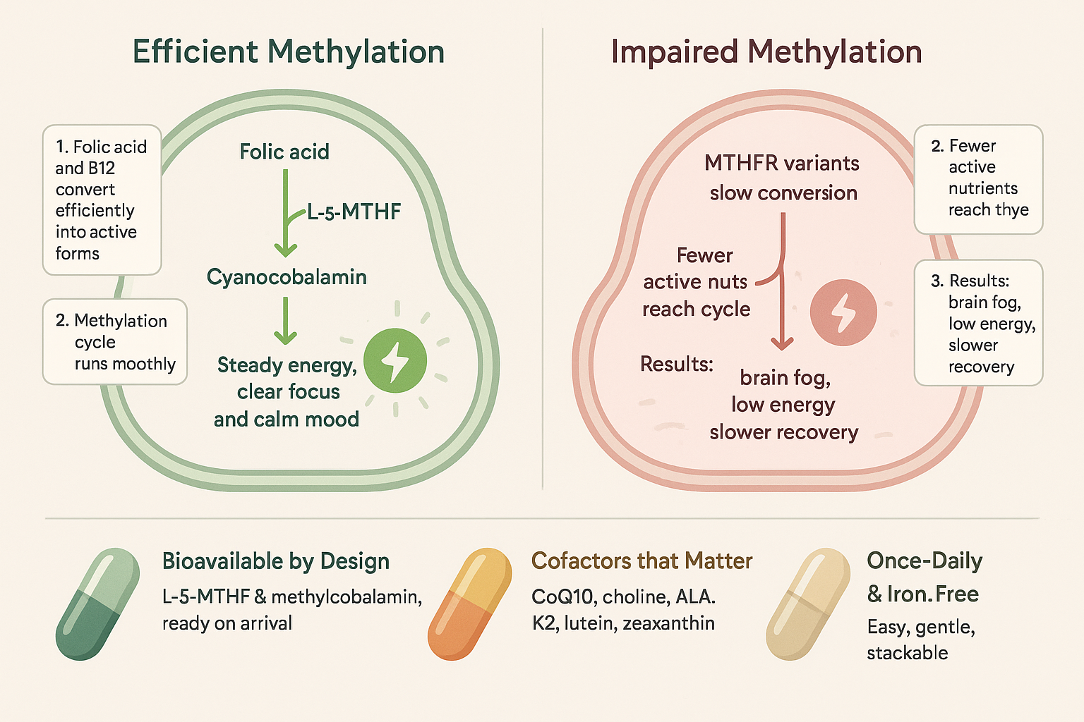 If you carry a common MTHFR gene variant, your body may struggle to activate folate and B12—so a typical multi doesn’t “click.”