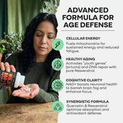 NMN and NR are NAD+ precursors—your body must convert them into NAD+. Our formula provides direct NAD+ plus two synergistic compounds: Quercetin to inhibit the CD38 enzyme that degrades NAD+, and Resveratrol to activate the sirtuin pathways that utilize NAD+. It's a complete system: replenish, protect, and activate.